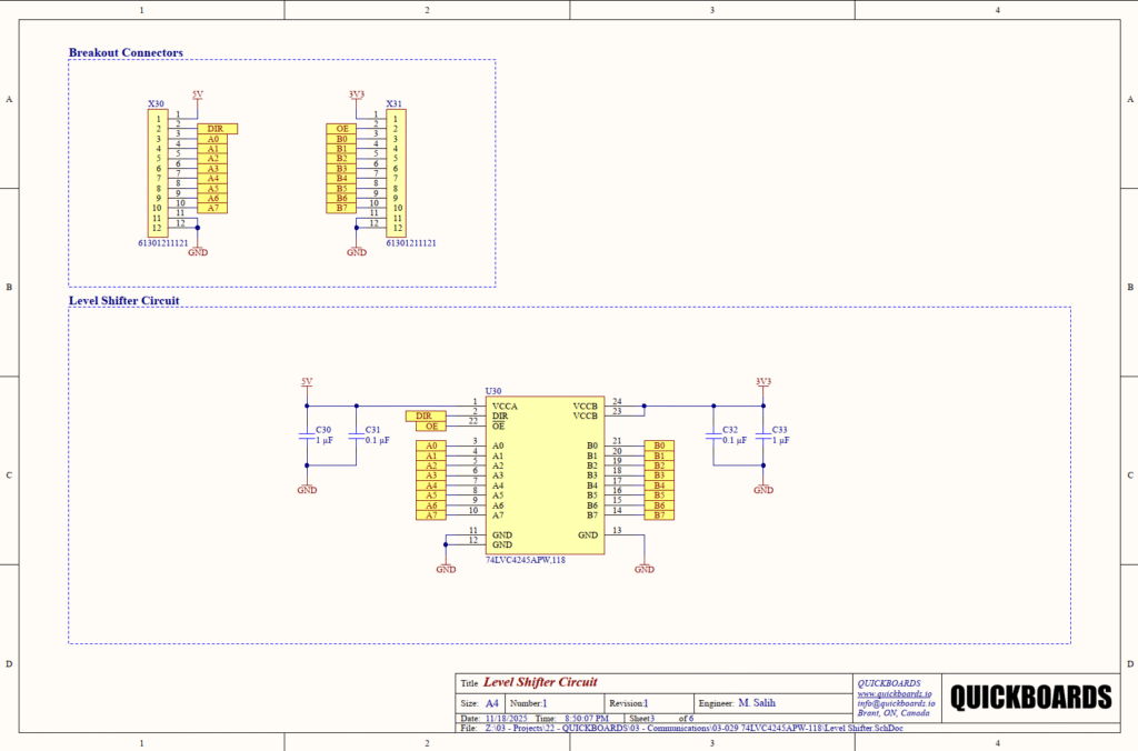 The A-port (5V) and B-port (3.3V) interface pins are designed for high-speed operation. To minimize signal reflections and crosstalk, the traces for A0-A7 and B0-B7 should be routed with matched lengths and consistent impedance. The schematic shows these ports broken out through J1 and J2 (X30, X31) connectors. Because the 74LVC4245A has a high output drive (24 mA), it can drive relatively long traces or backplanes, but the designer must be mindful of the increased power consumption and EMI associated with high-drive switching.