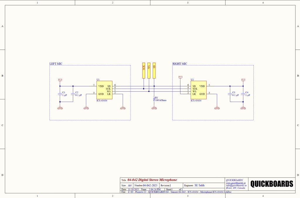 The digital core utilizes a three-wire I2S interface: SCK (Serial Clock), WS (Word Select), and SD (Serial Data). In this stereo implementation, the SD line is shared between both devices. To prevent bus contention, the LR pin (Pin 2) is used to assign each microphone to a specific phase of the WS clock. U1 has Pin 2 tied to 3.3V (Logic High), designating it as the “Left” microphone, which drives data on the first half of the WS cycle. U2 has Pin 2 tied to GND (Logic Low), designating it as the “Right” microphone, driving data on the second half of the cycle. When one microphone is driving the bus, the other enters a high-impedance state.