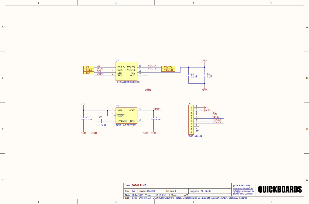 This modular schematic block provides a pre-validated hardware foundation for dual-channel analog signal generation. By utilizing a dedicated precision reference and optimized decoupling, this design eliminates the common errors associated with reference noise and supply instability. The compact footprint and standardized pin mapping allow you to drop this 10-bit DAC stage directly into your project, significantly reducing R&D time and ensuring predictable analog performance.