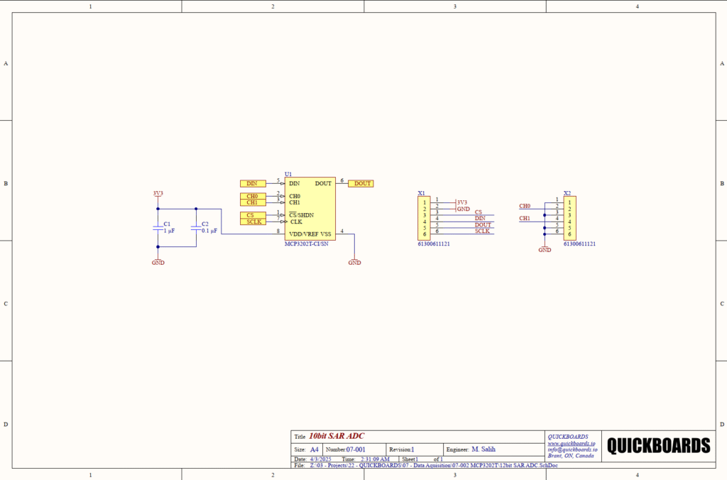 When integrating the MCP3202 block, the quality of the 3.3V rail is paramount. Since VDD and VREF are tied, any ripple on the power supply will translate directly into measurement error. Senior engineers will often place a ferrite bead in series with the 3V3 rail before the decoupling capacitors to further isolate the ADC from digital noise on the main power plane.