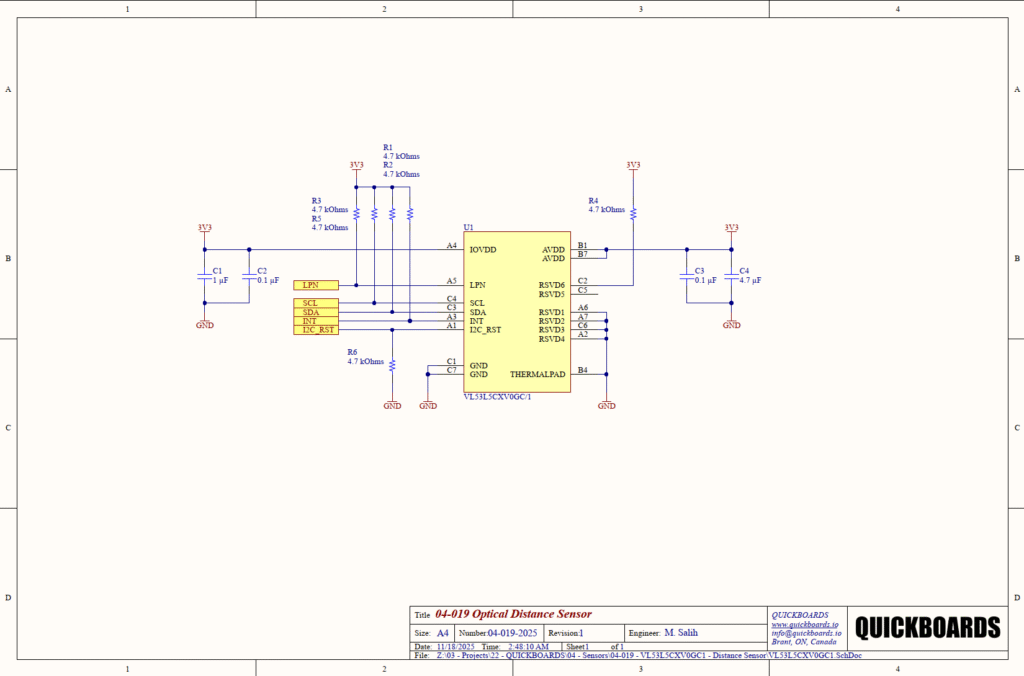 Senior engineers will note the treatment of the Reserved (RSVD) pins. Pins C2 and C5 are tied to 3.3V via R4 (4.7 kOhms). This is a manufacturer-specific requirement to bias internal logic correctly. Pins A2, A6, A7, and C6 are tied directly to the ground plane. This configuration maximizes the shielding of the sensitive SPAD array from electromagnetic interference and improves the thermal path from the silicon to the PCB ground plane.