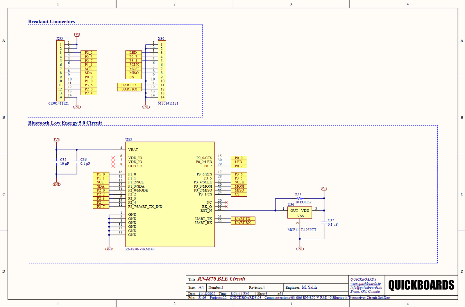 This schematic block features the RN4870‑V/RM140, a fully integrated Bluetooth Low Energy (BLE) radio module from Microchip. It includes a built-in Bluetooth stack and supports flexible operation via UART. The module is designed to simplify BLE integration by offloading the complexity of the radio and protocol stack from your main MCU.