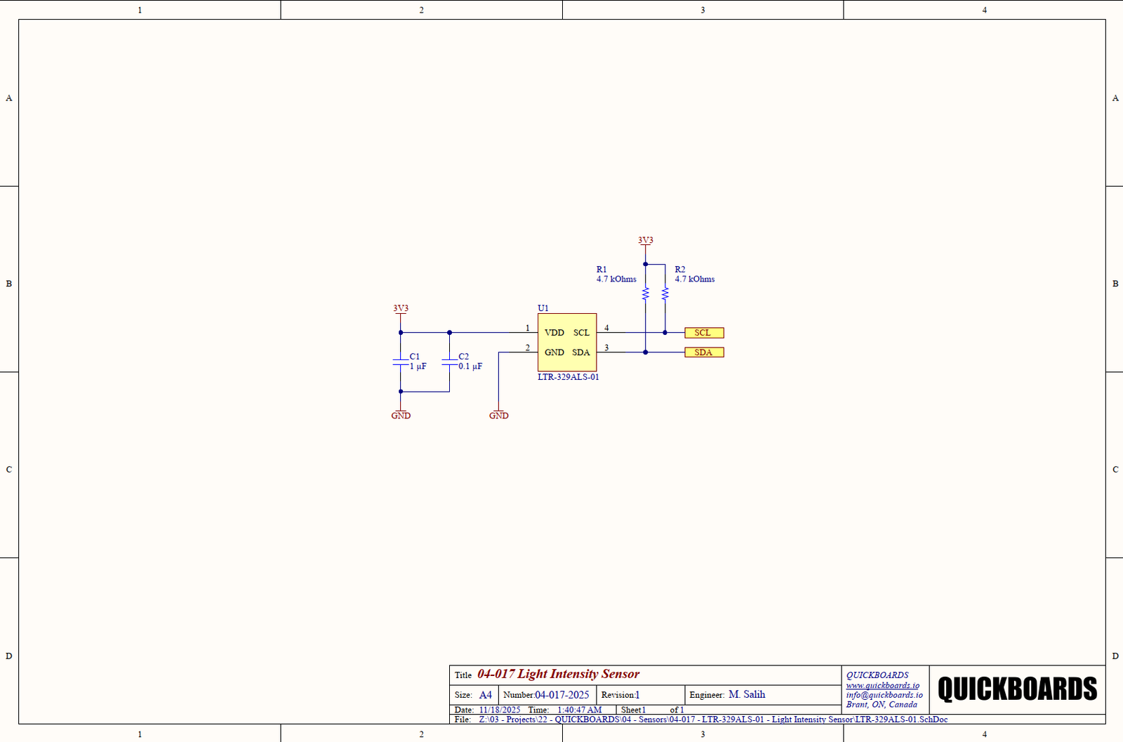 By integrating this Quickboards schematic block, engineers can quickly prototype light-based control systems, reduce analog complexity, and use a compact, power-efficient sensor for reliable ambient light measurement.