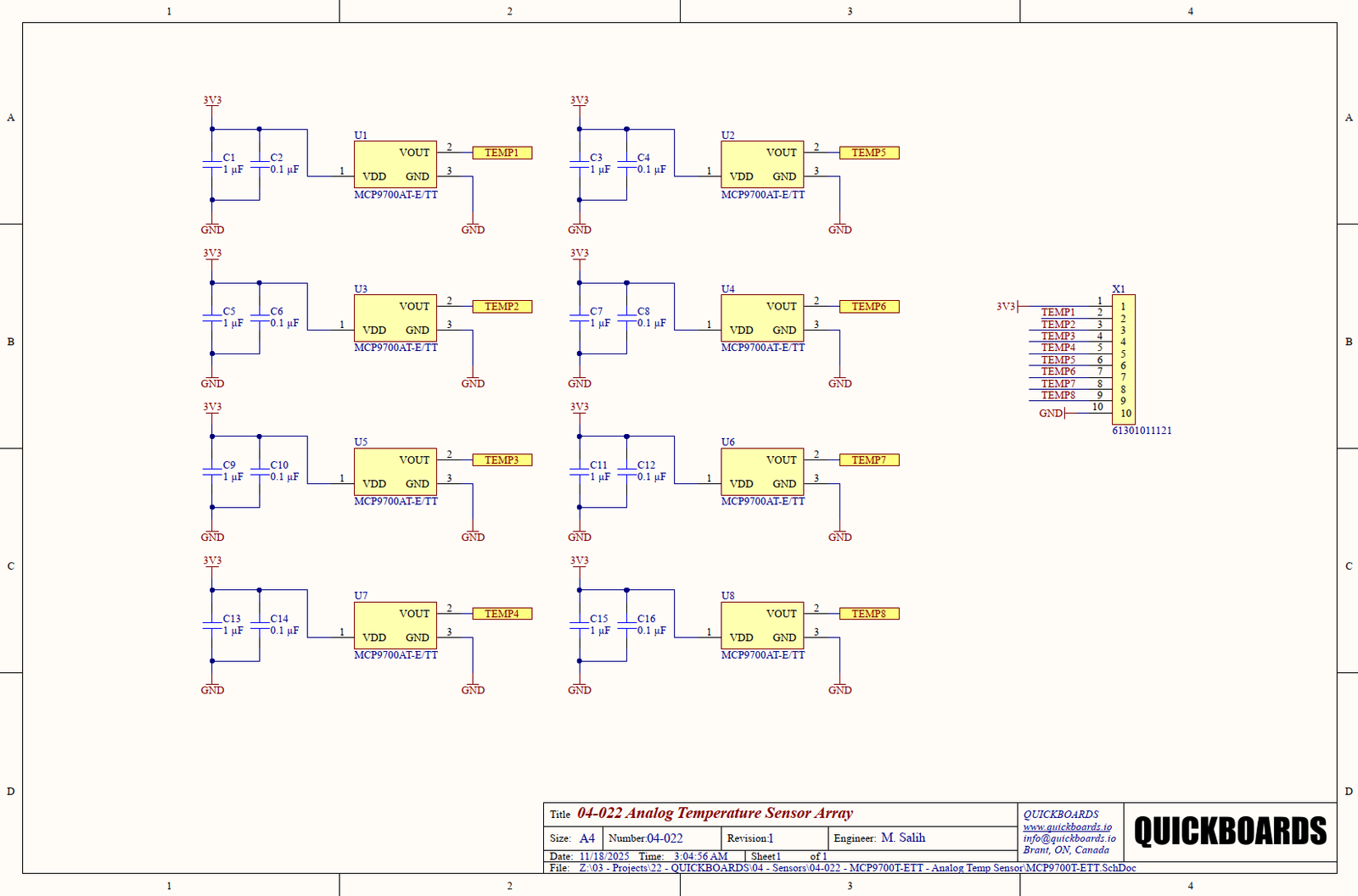 By integrating this Quickboards schematic block, engineers can add a compact, low-power, accurate analog temperature sensor without external calibration, simplifying design and enabling reliable thermal monitoring in embedded systems.