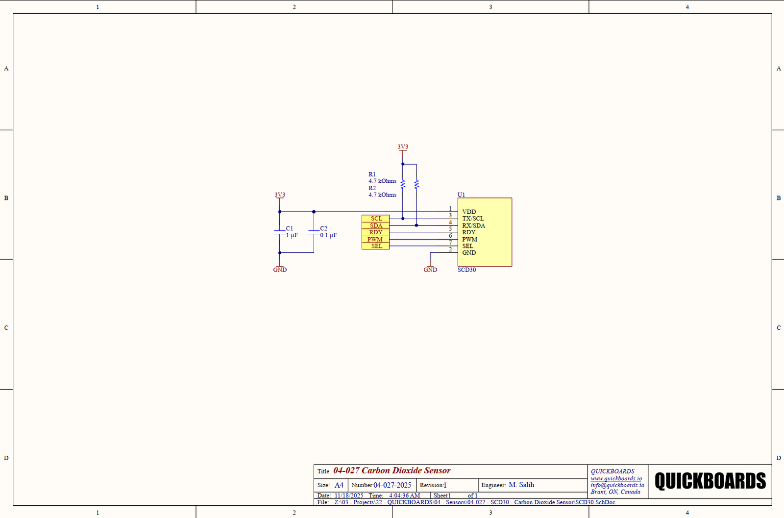 By integrating this Quickboards schematic block, engineers can rapidly prototype CO₂ monitoring systems, minimize analog front-end complexity, and take advantage of a fully calibrated, reliable sensor with digital output ready for immediate integration.